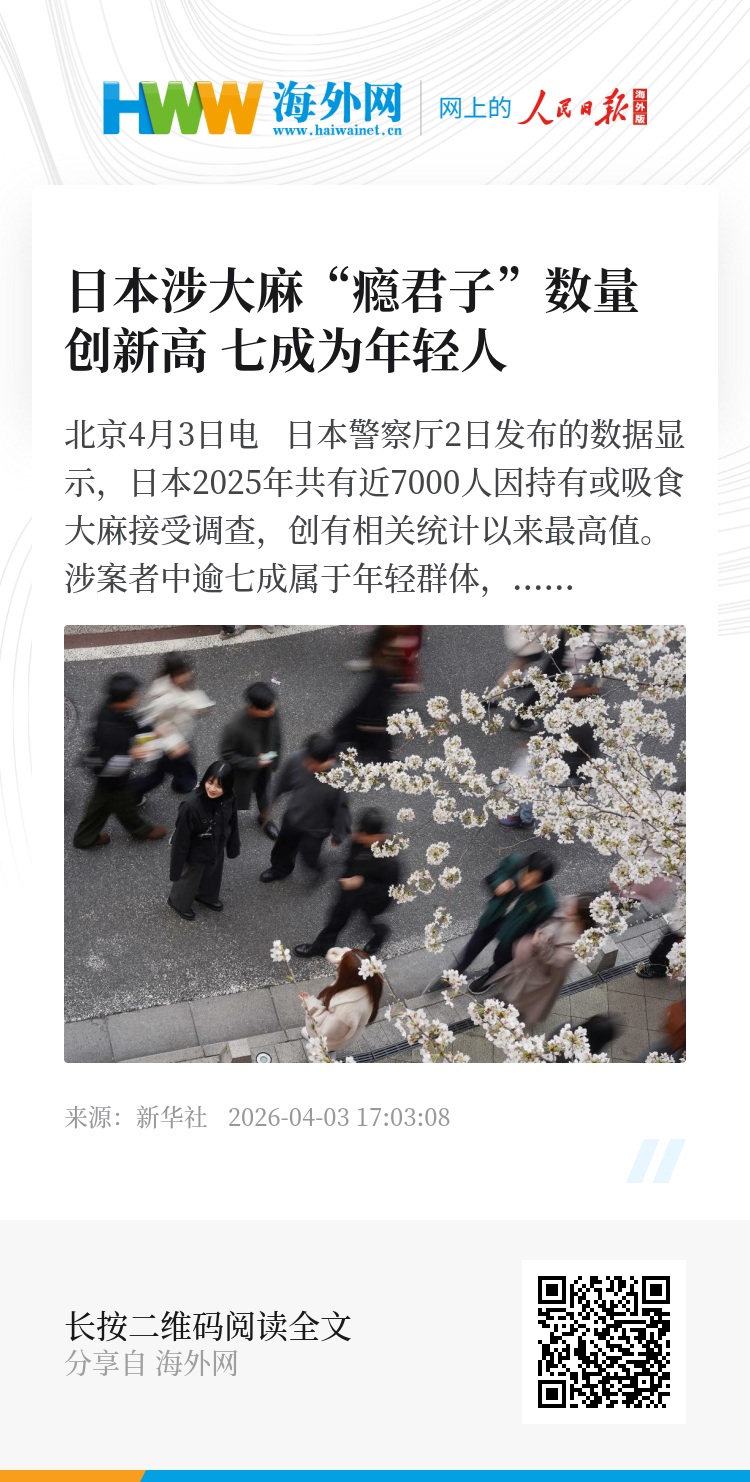 新华社北京4月3日电 日本警察厅2日发布的数据显示,日本2025年共有近7000人因持有或吸食大麻接受调查,创有相关统计以来最高值。涉案者中逾七成属于年轻群体,大麻对日本年轻群体的侵蚀状况日益严重。