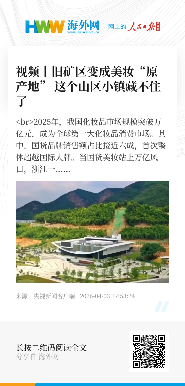 2025年,我国化妆品市场规模突破万亿元,成为全球第一大化妆品消费市场。其中,国货品牌销售额占比接近六成,首次整体超越国际大牌。当国货美妆站上万亿风口,浙江一座小镇的蜕变引人注目。埭溪镇,从昔日破旧矿区,成长为全国三大美妆产业集聚区之一。小镇的蝶变从何而来?我们去一探究竟。