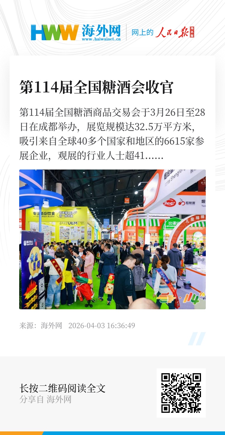 第114届全国糖酒商品交易会于3月26日至28日在成都举办,展览规模达32.5万平方米,吸引来自全球40多个国家和地区的6615家参展企业,观展的行业人士超41万人次。