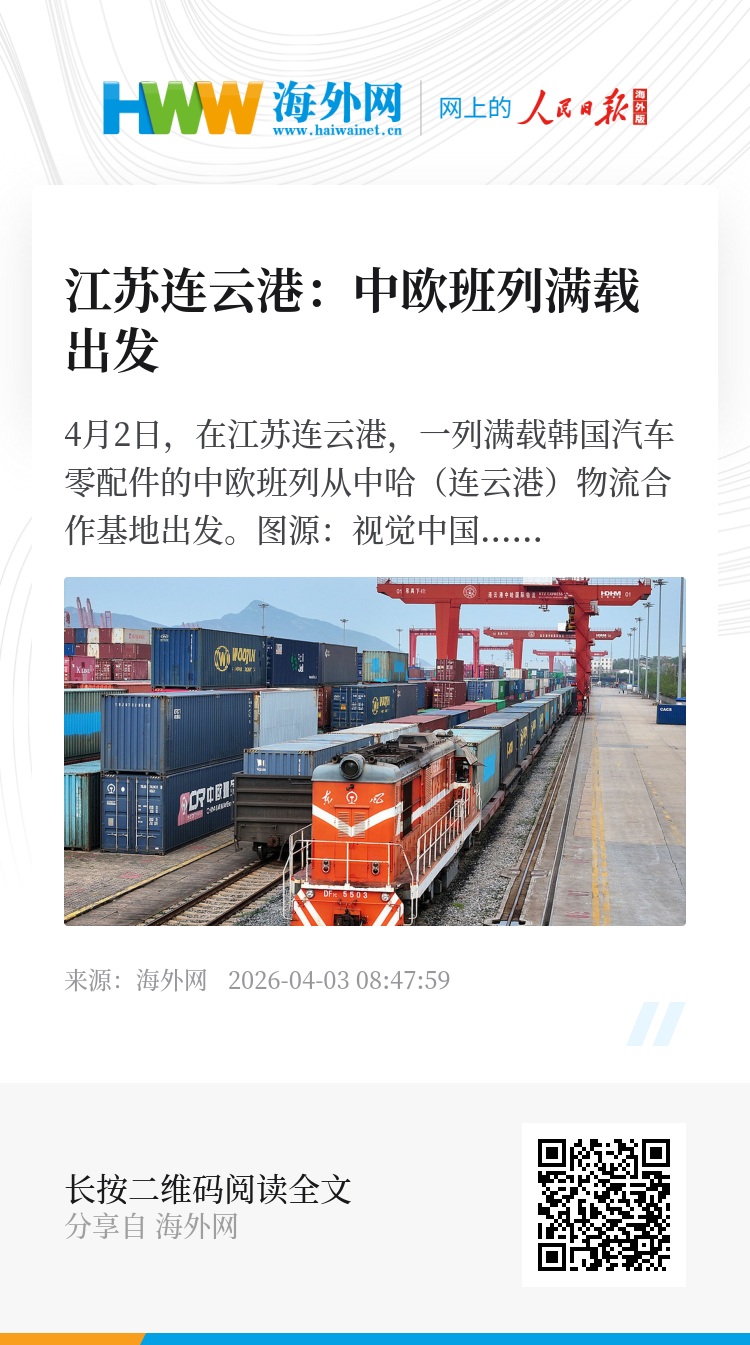 32942769,.江苏连云港:中欧班列满载出发,.2026-04-03 08:47:59,.204555,.陈菲扬、卢思宇