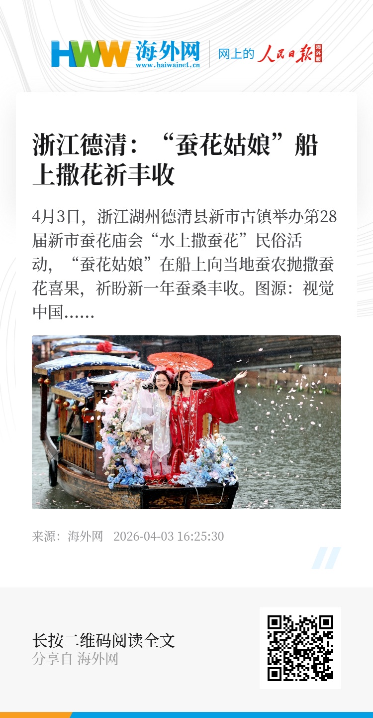 4月3日,浙江湖州德清县新市古镇举办第28届新市蚕花庙会“水上撒蚕花”民俗活动,“蚕花姑娘”在船上向当地蚕农抛撒蚕花喜果,祈盼新一年蚕桑丰收。图源:视觉中国