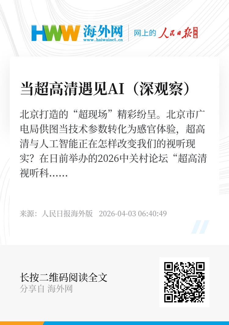 在日前举办的2026中关村论坛“超高清视听科技创新发展论坛”现场,嘉宾们提及的一些细节令人印象深刻:中国马年春晚舞台上,通过AI大模型“复活”的徐悲鸿《六骏图》,让水墨骏马在屏幕上展现出鲜活的生命律动;在北京市广电局打造的“超现场”项目中,中外优秀剧目跨越时空,让海内外观众在本地影剧院便能同步感受到艺术的震撼……