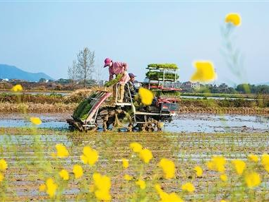在江西省九江市都昌县蔡岭镇杨湾村,村民驾驶农机种植早稻。
