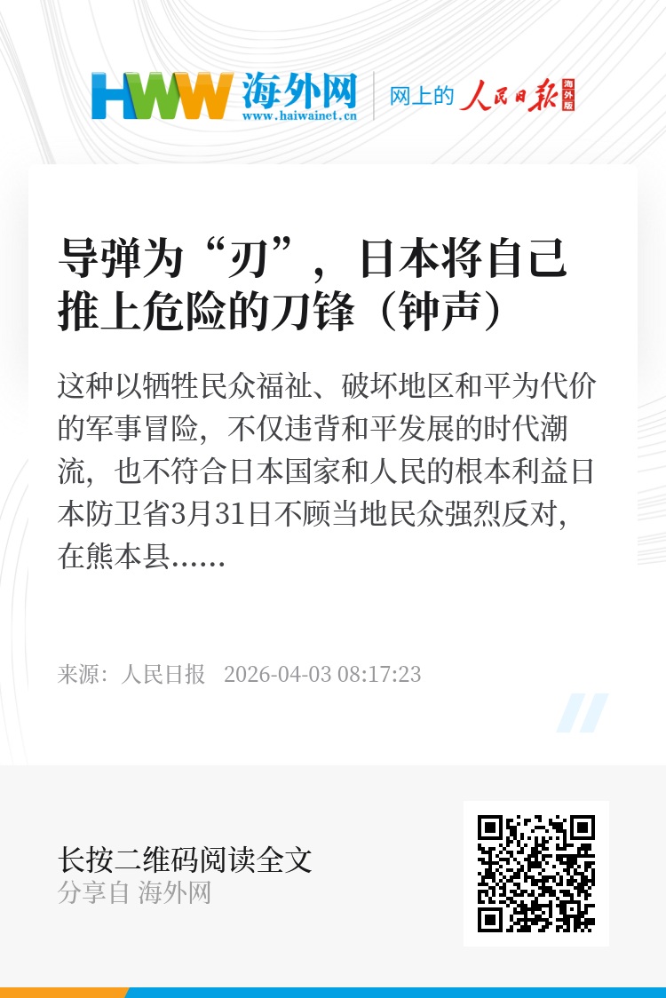 日本国内民众对此也表达了强烈反对,多地民众举行集会抗议,反对政府强行推进军事部署。日本共同社报道称,防卫省曾在熊本等地举办面向政府官员的装备展示会,但并未举行面向民众的说明会。考虑到现代战争中部署远程导弹的地区容易成为被攻击目标,当地民众强烈反对导弹部署。这种以牺牲民众福祉、破坏地区和平为代价的军事冒险,不仅违背和平发展的时代潮流,也不符合日本国家和人民的根本利益。“威慑力根本无法缔造和平”“我们不需要用于备战的导弹”“停止部署导弹”……日本政府应好好听听民众的心声,停止以发展军力将民生绑上战车,真正做到对本国国民负责、对地区和平负责。