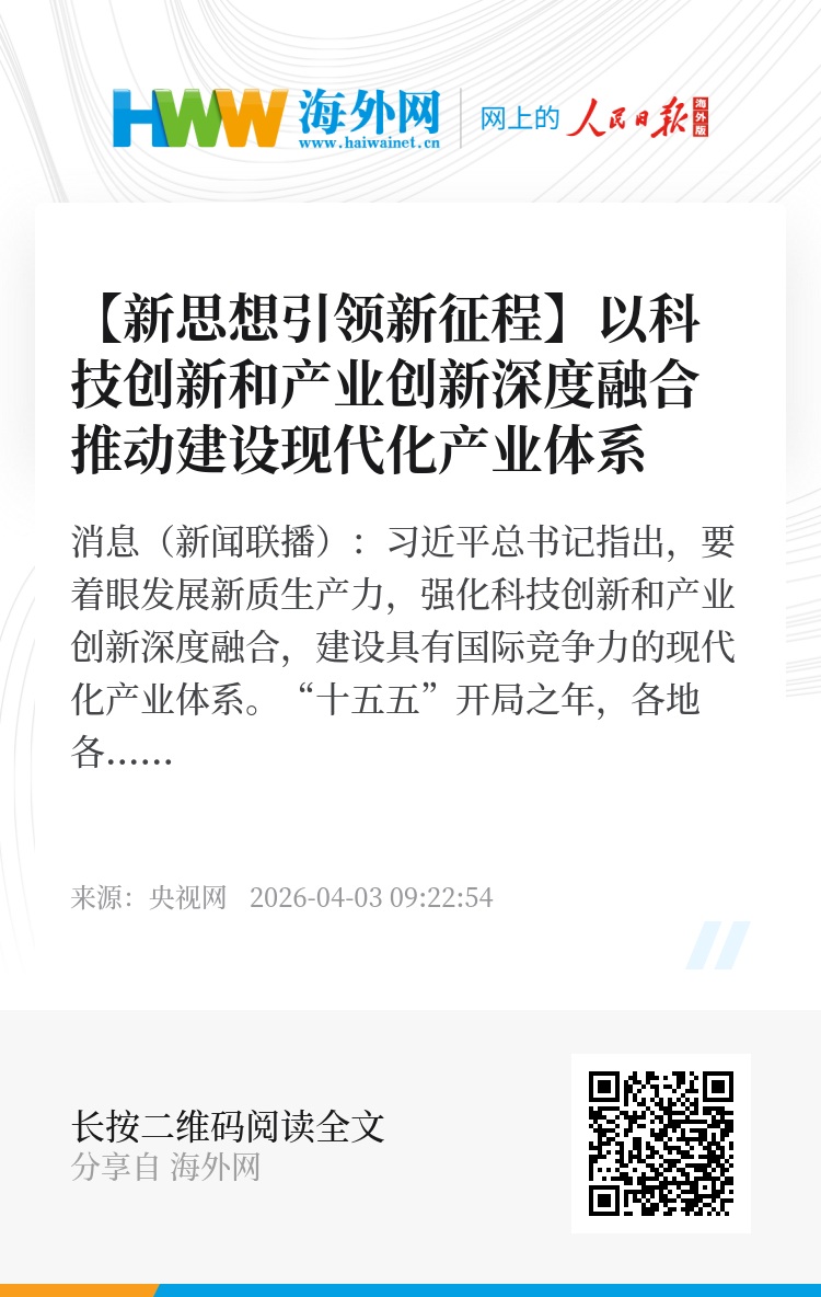 央视网消息(新闻联播):习近平总书记指出,要着眼发展新质生产力,强化科技创新和产业创新深度融合,建设具有国际竞争力的现代化产业体系。