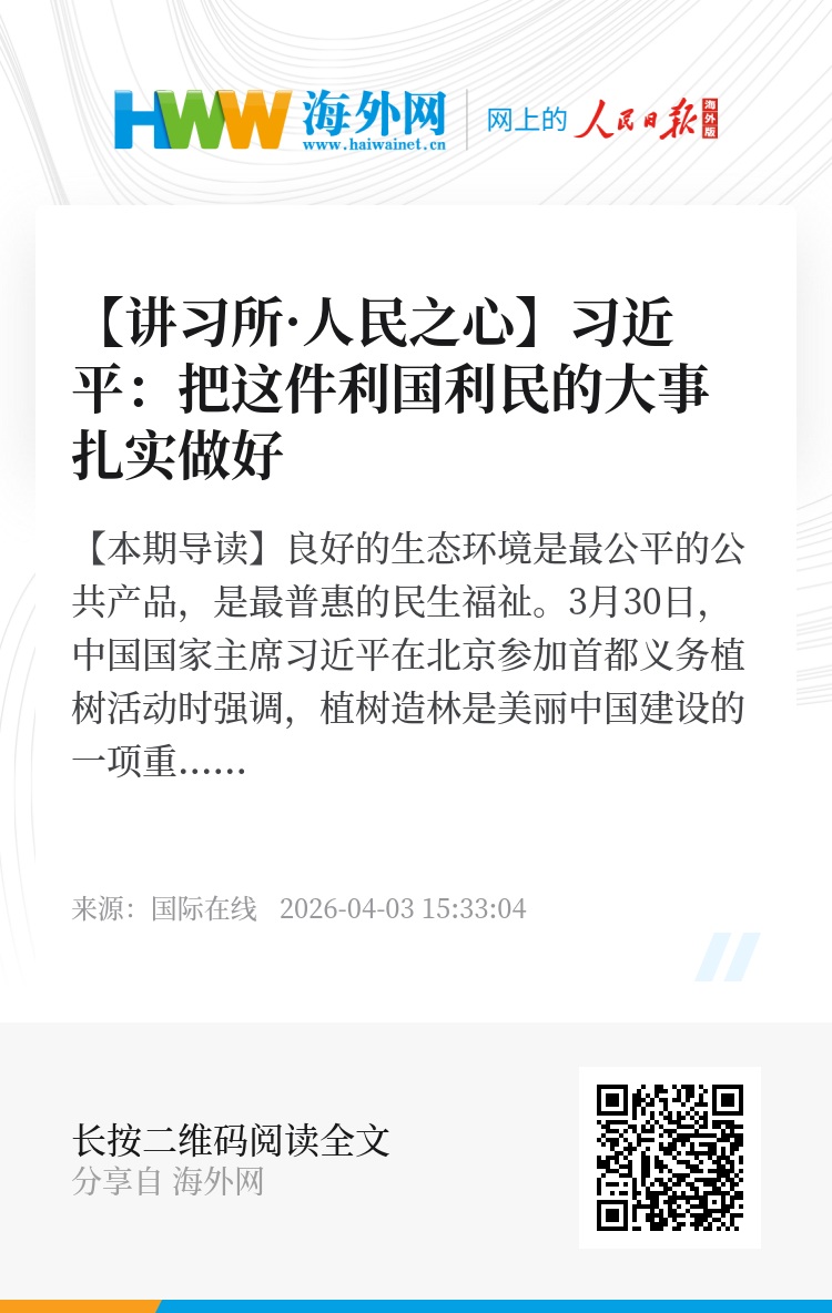 良好的生态环境是最公平的公共产品,是最普惠的民生福祉。3月30日,中国国家主席习近平在北京参加首都义务植树活动时强调,植树造林是美丽中国建设的一项重要任务,要咬定青山不放松,立足当下、着眼长远、接力奋进,把这件利国利民的大事扎实做好。