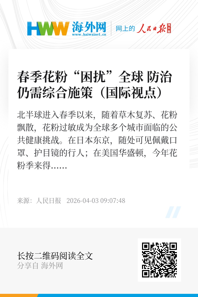 北半球进入春季以来,随着草木复苏、花粉飘散,花粉过敏成为全球多个城市面临的公共健康挑战。在日本东京,随处可见佩戴口罩、护目镜的行人;在美国华盛顿,今年花粉季来得更早、持续时间更长,加重了不少民众的过敏反应;在法国巴黎,为应对花粉过敏难题,市政机构加大了监测和预警力度。世界卫生组织在报告中指出,花粉过敏作为与生态环境、气候变化紧密相关的公共健康问题,需要各国立足长远、科学施策、持续发力,既要以积极举措缓解民众当下困扰,也要循序渐进推进源头治理,逐步破解这一难题。