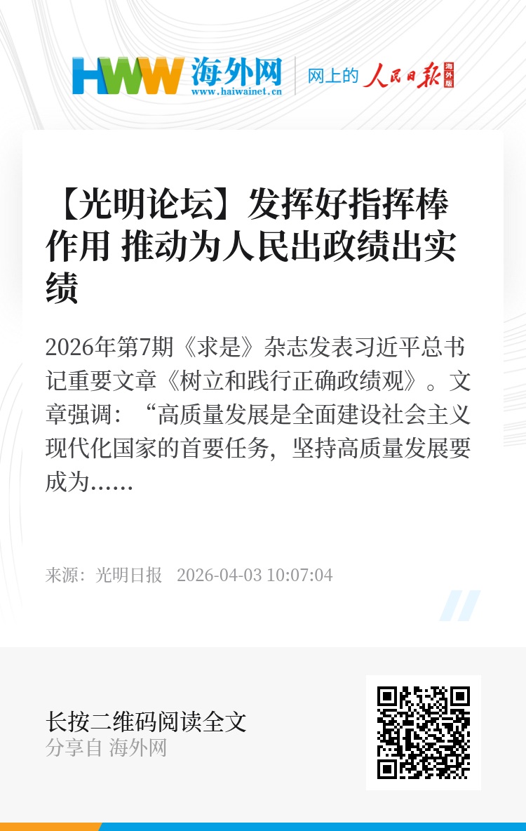 2026年第7期《求是》杂志发表习近平总书记重要文章《树立和践行正确政绩观》。文章强调:“高质量发展是全面建设社会主义现代化国家的首要任务,坚持高质量发展要成为领导干部政绩观的重要内容。要完善推动高质量发展的政绩考核评价办法,发挥好指挥棒作用,推动各级领导班子认真践行正确政绩观,切实形成正确工作导向。”“要完善差异化考核评价体系,提高考评针对性和科学性,防止出现‘数字出官、官出数字’的恶性循环。”