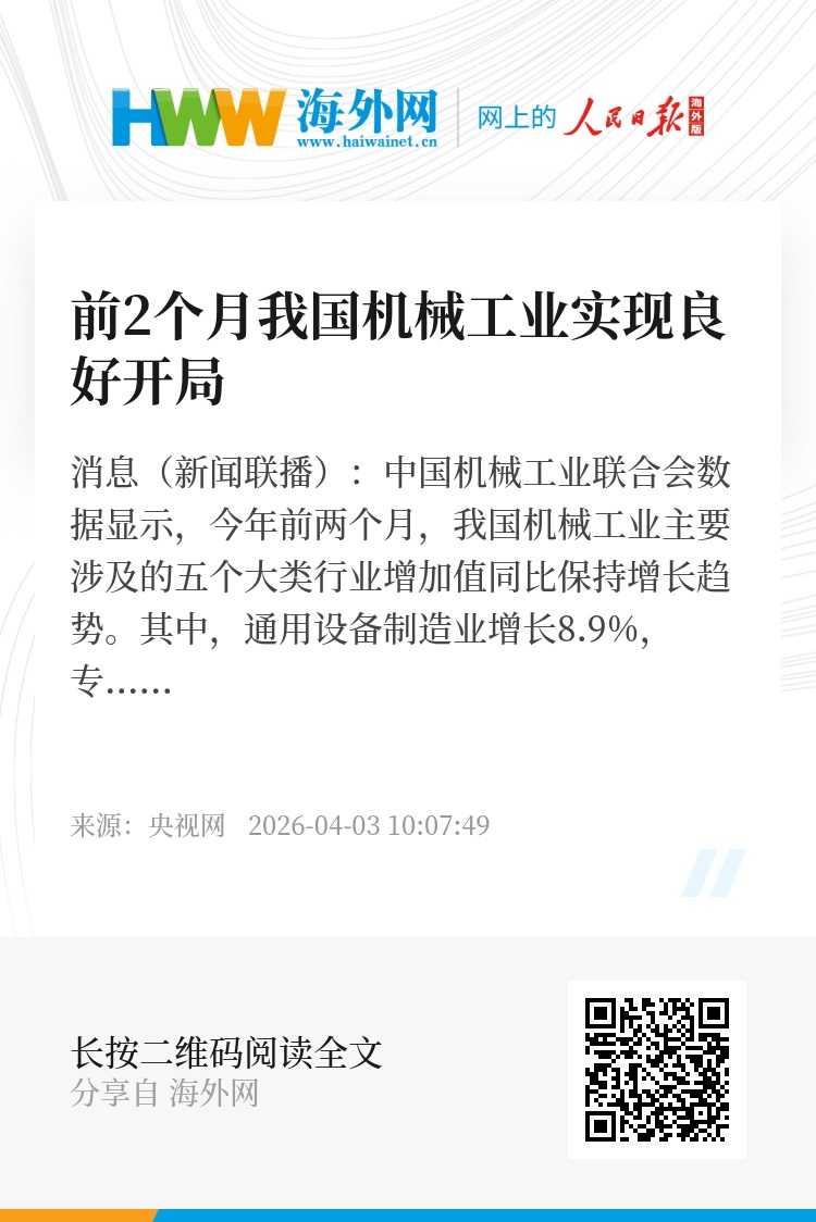 央视网消息(新闻联播):中国机械工业联合会数据显示,今年前两个月,我国机械工业主要涉及的五个大类行业增加值同比保持增长趋势。其中,通用设备制造业增长8.9%,专用设备制造业增长8.8%,汽车制造业增长3.4%。各类产品生产供给增长加快,市场需求稳中有升,机械工业实现良好开局。
