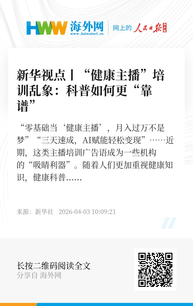 随着人们更加重视健康知识,健康科普类账号备受青睐,“健康主播”培训也日趋火爆。然而,一些速成培训暗藏陷阱,侵害群众利益。治理行业乱象、筑牢公众科学防线,科普如何更“靠谱”?