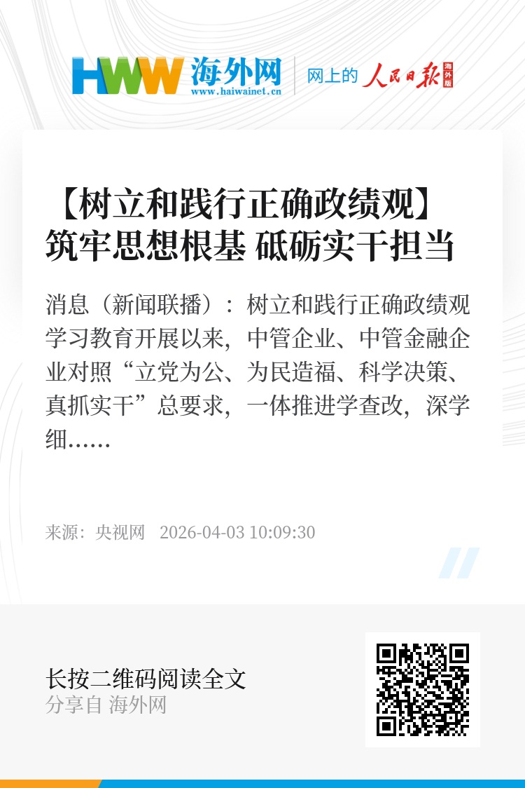 央视网消息(新闻联播):树立和践行正确政绩观学习教育开展以来,中管企业、中管金融企业对照“立党为公、为民造福、科学决策、真抓实干”总要求,一体推进学查改,深学细悟、学用结合,推动学习教育走深走实、见行见效。