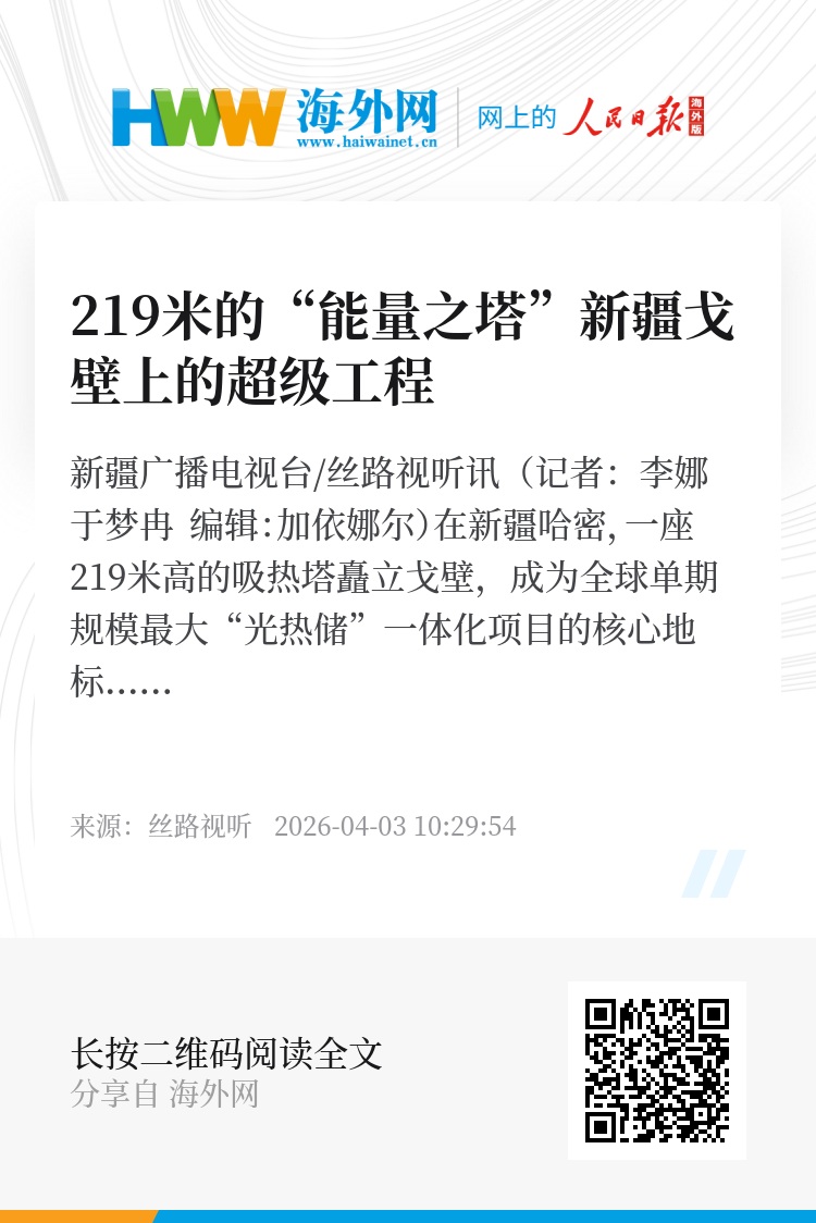 新疆广播电视台/丝路视听讯(记者:李娜 于梦冉 编辑:加依娜尔)在新疆哈密,一座219米高的吸热塔矗立戈壁,成为全球单期规模最大“光热储”一体化项目的核心地标。项目总装机1500兆瓦,目前吸热塔砌筑已全部完成,上塔熔盐管道安装完成80%,预计10月底具备并网条件,年底塔体将点亮。建成后年发清洁电30亿度,为国家能源转型注入强劲动力。