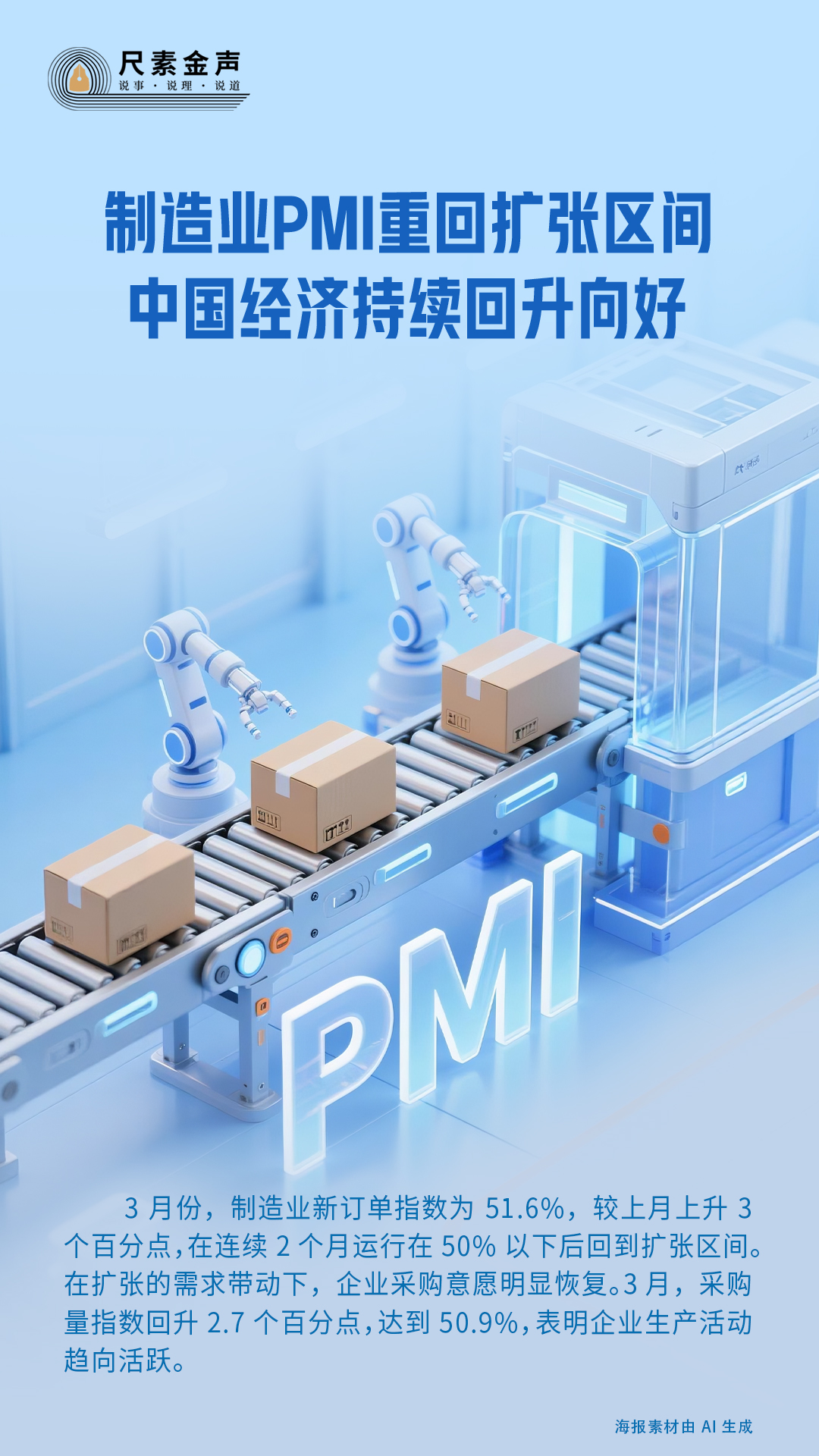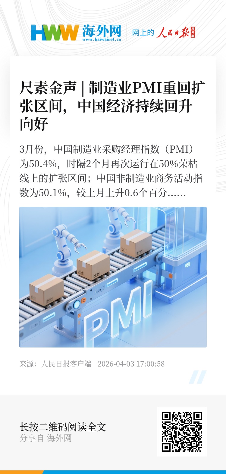 3月份,中国制造业采购经理指数(PMI)为50.4%,时隔2个月再次运行在50%荣枯线上的扩张区间;中国非制造业商务活动指数为50.1%,较上月上升0.6个百分点,连续2个月环比上升;综合PMI产出指数为50.5%,较上月上升1个百分点。从三个先行性指数回升,我们看到了中国经济的活力和韧性。