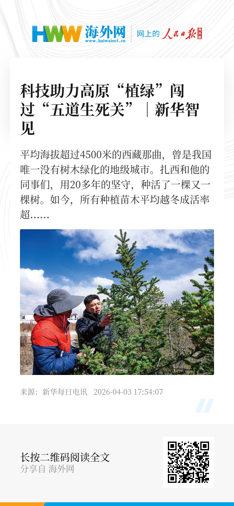 “以前种树,就像把孩子放在保温箱里,离了科技手段就活不了。”他说,“以后,我们想让树能‘断奶’。选育更适应高寒高海拔环境的树种,让树木靠自身能力过冬。”