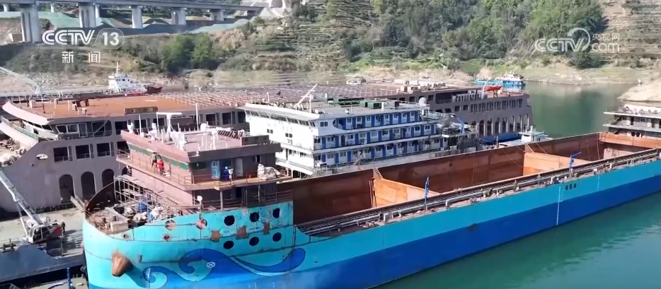 绿色航运也带动了相关产业的发展。就在服务区旁边就是秭归的绿色智能船舶产业基地,长江内河首艘万吨级纯电动运输船“葛洲坝号”正在加紧建造,眼下正在进行舾装作业,也就船体设备的安装调试工作,预计今年上半年交付使用。