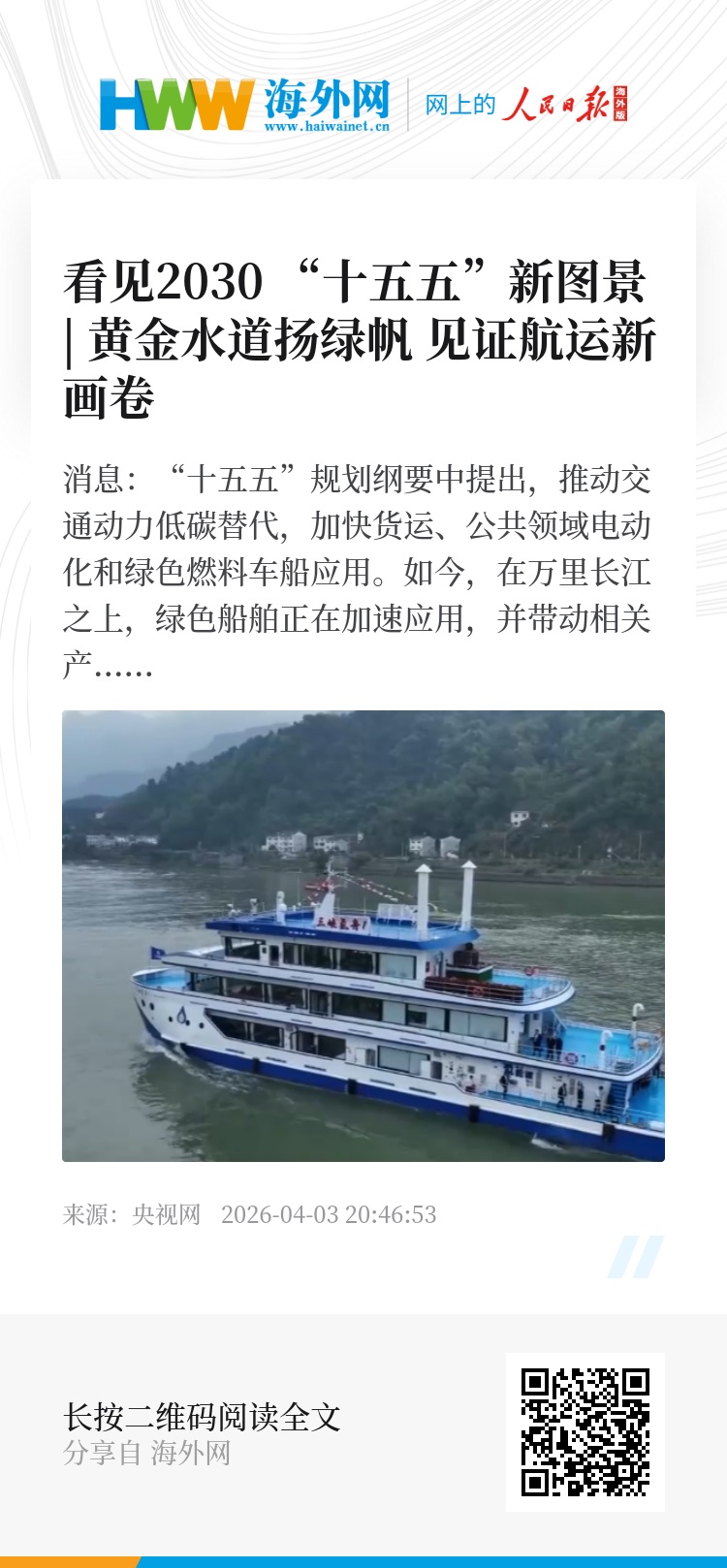 央视网消息:“十五五”规划纲要中提出,推动交通动力低碳替代,加快货运、公共领域电动化和绿色燃料车船应用。如今,在万里长江之上,绿色船舶正在加速应用,并带动相关产业蓬勃发展。