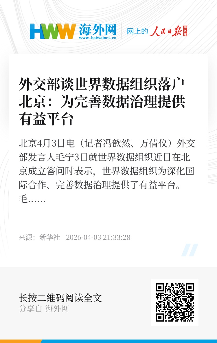 新华社北京4月3日电(记者冯歆然、万倩仪)外交部发言人毛宁3日就世界数据组织近日在北京成立答问时表示,世界数据组织为深化国际合作、完善数据治理提供了有益平台。