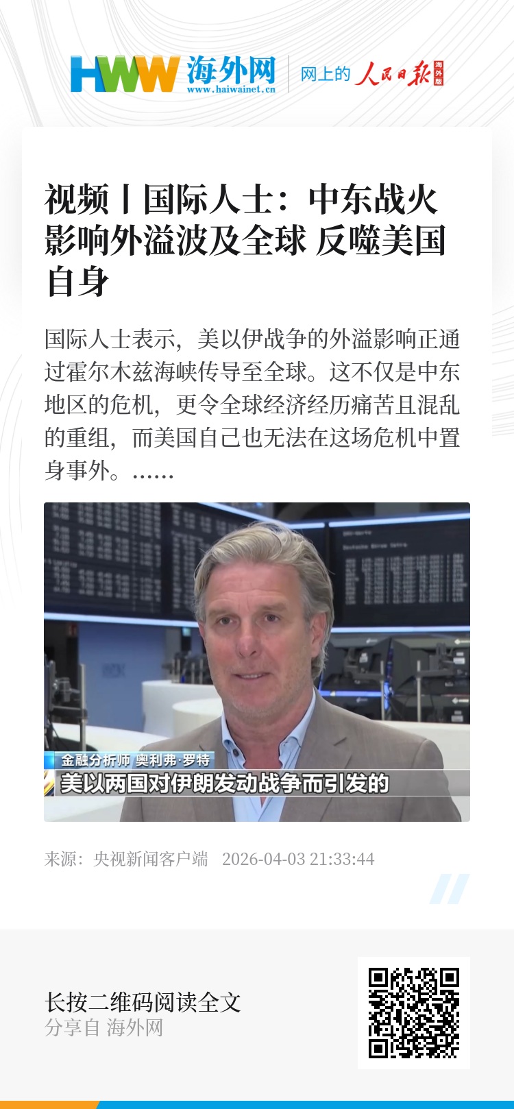 金融分析师 奥利弗·罗特:首先必须指出的是,这个问题实际上是因为美以两国对伊朗发动战争而引发的。换句话说,美国和以色列应该对此负责。其次,如果有人认为,美国的油价能够独立于全球石油市场,那就是一派胡言。因此,霍尔木兹海峡的局势,自然会导致美国国内油价和能源价格整体上涨,这就是美国面临的问题。