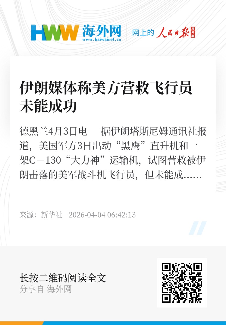 新华社德黑兰4月3日电 据伊朗塔斯尼姆通讯社报道,美国军方3日出动“黑鹰”直升机和一架C-130“大力神”运输机,试图营救被伊朗击落的美军战斗机飞行员,但未能成功。