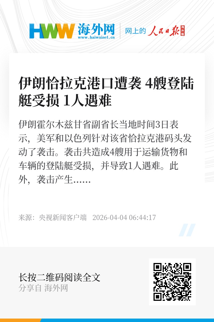 伊朗霍尔木兹甘省副省长当地时间3日表示,美军和以色列针对该省恰拉克港码头发动了袭击。袭击共造成4艘用于运输货物和车辆的登陆艇受损,并导致1人遇难。
