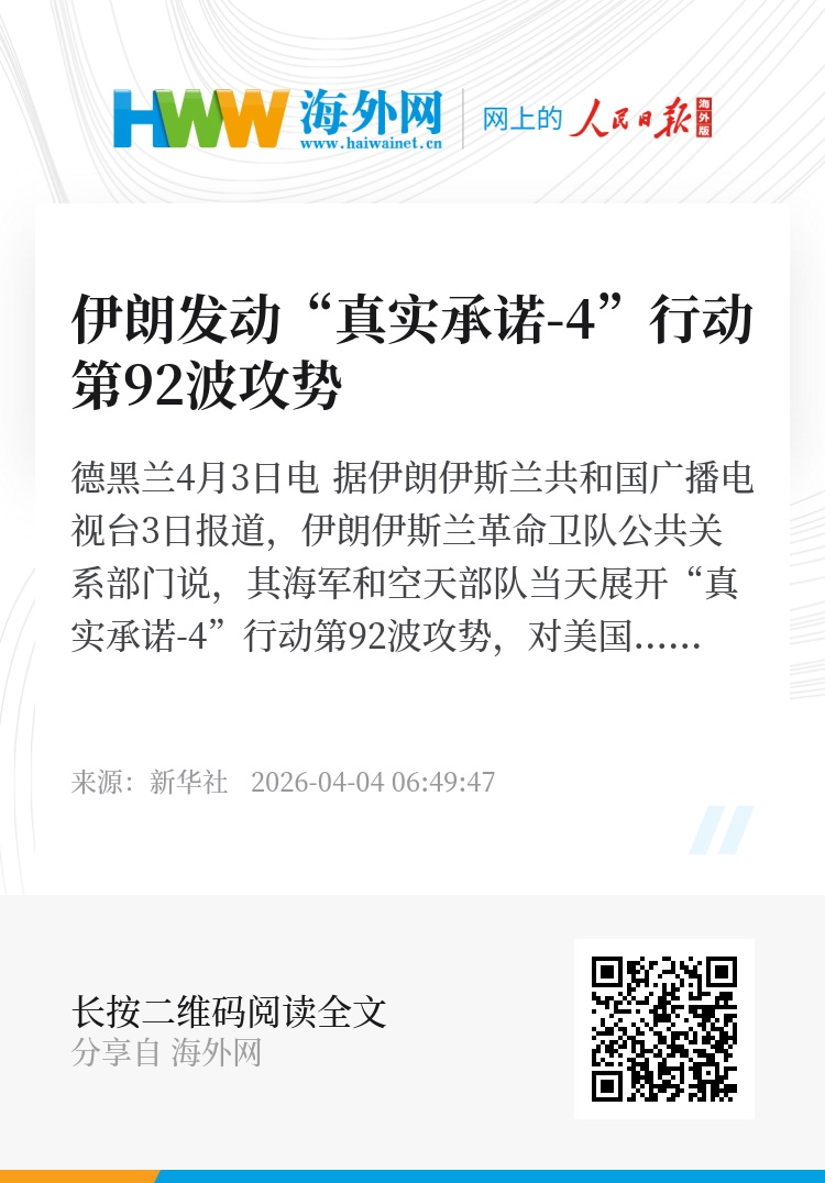 新华社德黑兰4月3日电 据伊朗伊斯兰共和国广播电视台3日报道,伊朗伊斯兰革命卫队公共关系部门说,其海军和空天部队当天展开“真实承诺-4”行动第92波攻势,对美国及以色列相关目标实施打击。