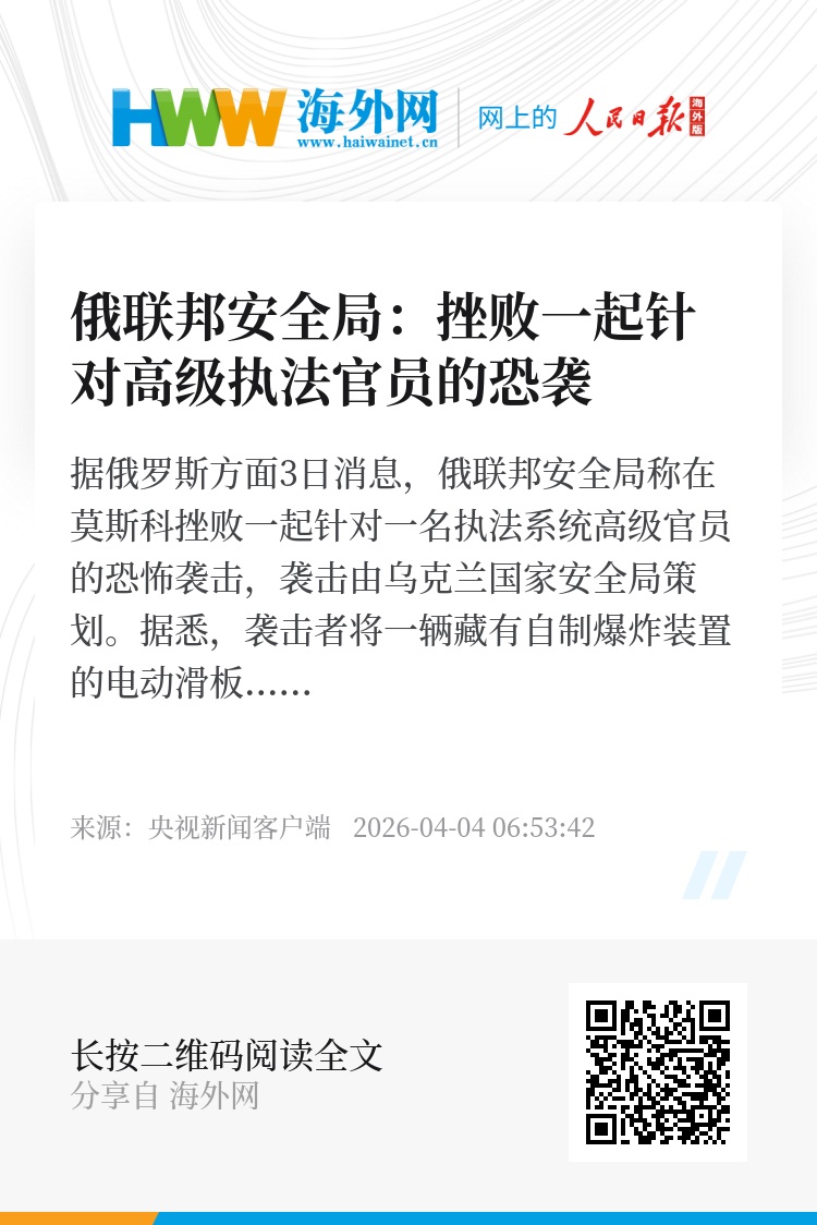 据俄罗斯方面3日消息,俄联邦安全局称在莫斯科挫败一起针对一名执法系统高级官员的恐怖袭击,袭击由乌克兰国家安全局策划。
