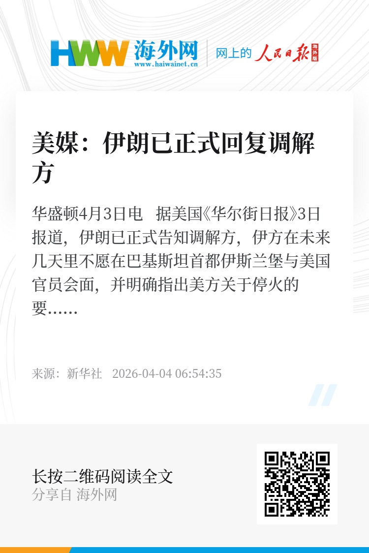 新华社华盛顿4月3日电 据美国《华尔街日报》3日报道,伊朗已正式告知调解方,伊方在未来几天里不愿在巴基斯坦首都伊斯兰堡与美国官员会面,并明确指出美方关于停火的要求不可接受。