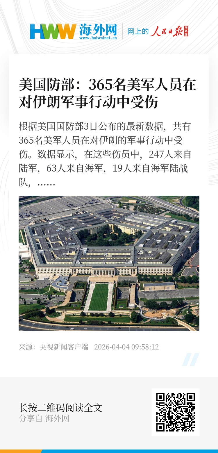 根据美国国防部3日公布的最新数据,共有365名美军人员在对伊朗的军事行动中受伤。