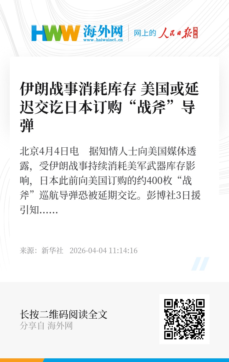新华社北京4月4日电 据知情人士向美国媒体透露,受伊朗战事持续消耗美军武器库存影响,日本此前向美国订购的约400枚“战斧”巡航导弹恐被延期交讫。