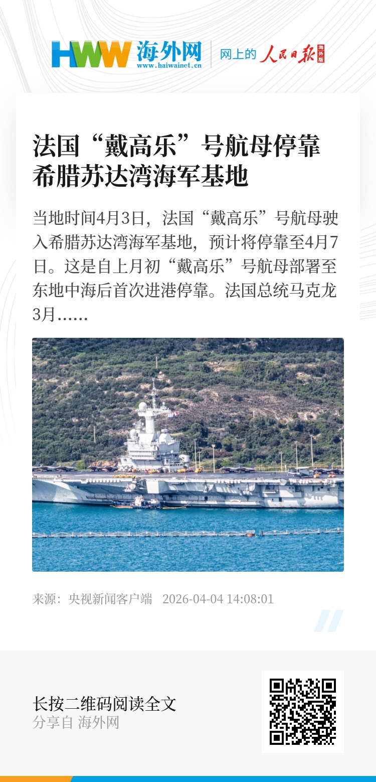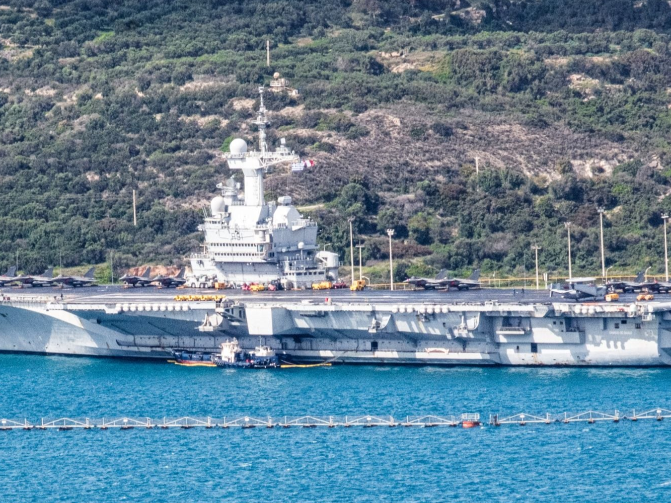 当地时间4月3日,法国“戴高乐”号航母驶入希腊苏达湾海军基地,预计将停靠至4月7日。
