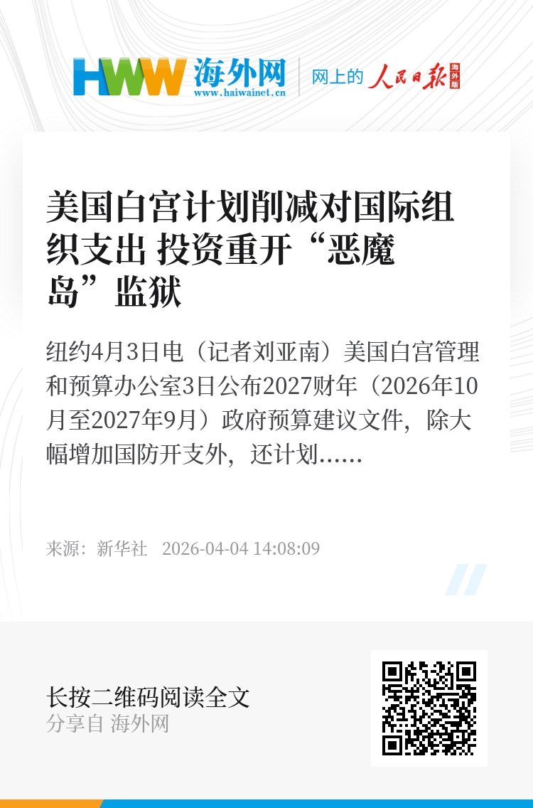 新华社纽约4月3日电(记者刘亚南)美国白宫管理和预算办公室3日公布2027财年(2026年10月至2027年9月)政府预算建议文件,除大幅增加国防开支外,还计划削减对联合国等国际组织的支出,并计划投入资金改建并重启加利福尼亚州阿尔卡特拉斯岛(又名“恶魔岛”)联邦监狱。