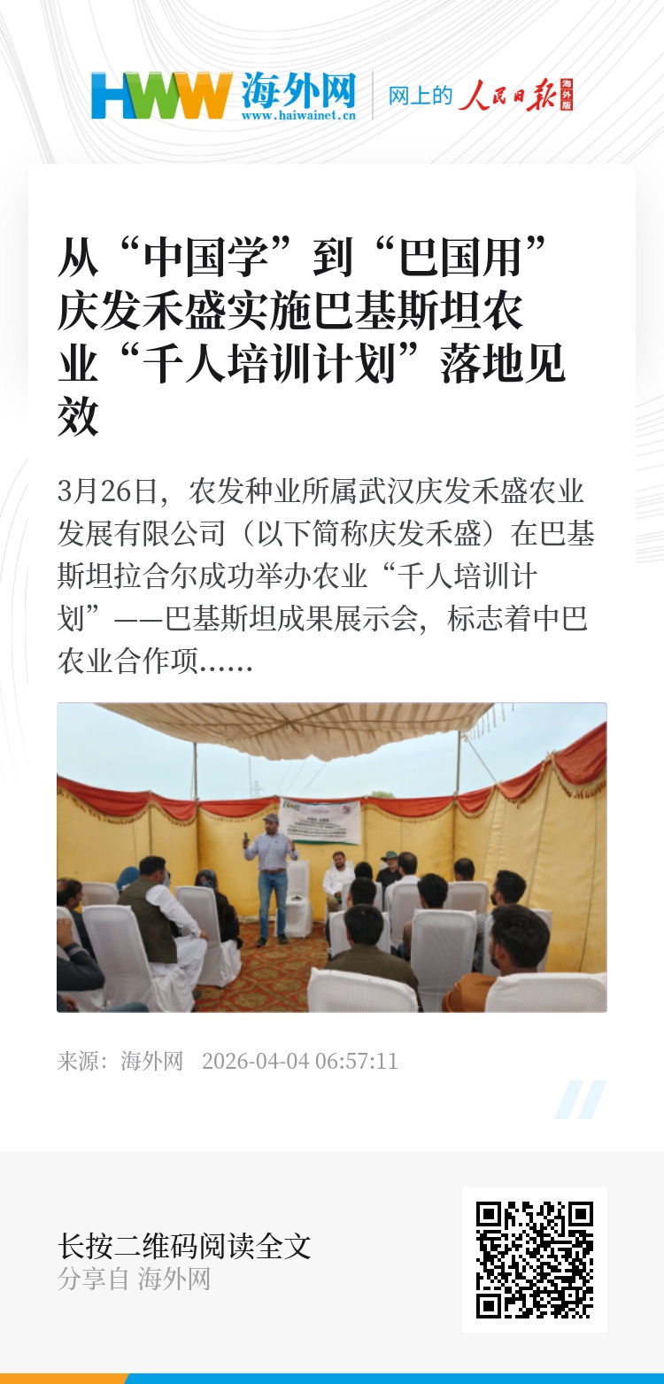 3月26日,农发种业所属武汉庆发禾盛农业发展有限公司(以下简称庆发禾盛)在巴基斯坦拉合尔成功举办农业“千人培训计划”——巴基斯坦成果展示会,标志着中巴农业合作项目从人才培训走向实地应用,实现“中国学、巴国用”的深度转化。