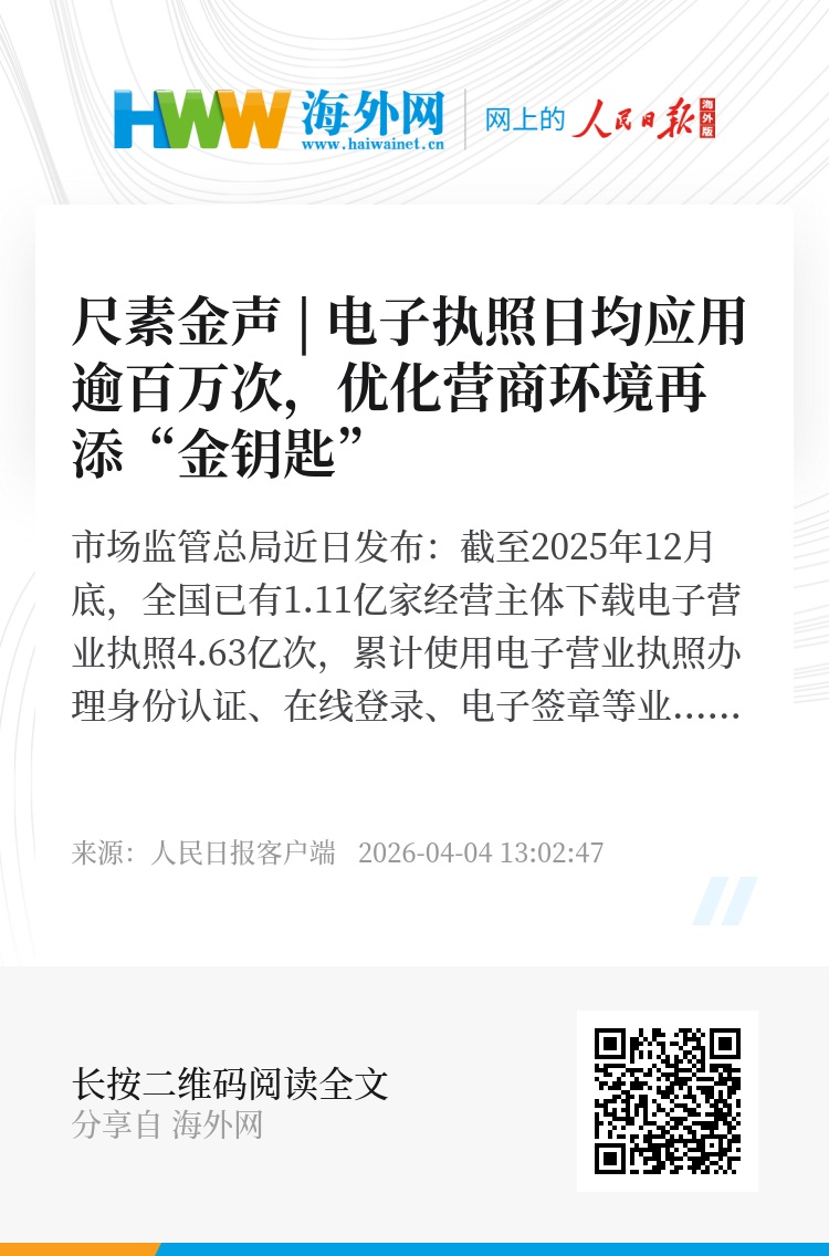 市场监管总局近日发布:截至2025年12月底,全国已有1.11亿家经营主体下载电子营业执照4.63亿次,累计使用电子营业执照办理身份认证、在线登录、电子签章等业务超10.02亿次,日均应用量达120多万次。各地区各部门已有1900多个业务系统实现电子营业执照的应用对接。可见,电子营业执照已经成为助力企业发展、优化营商环境的一把“金钥匙”。