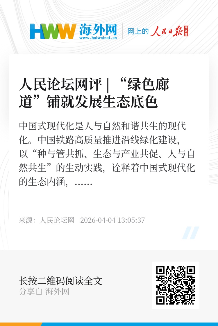 铁龙驰骋,山河如画。铁路网里的绿意,正在绿水青山间不断向远铺展,成为美丽中国的一道亮丽风景线。阔步“十五五”,中国铁路将继续以“绿”为笔,在广袤神州大地上绘就更多“人与自然和谐共生”的壮美图景,让中国式现代化的底色更加亮丽。(李红红)