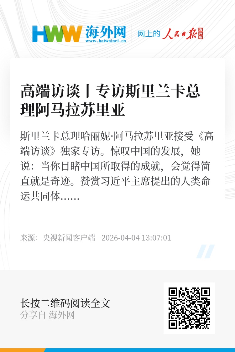 在专访中,阿马拉苏里亚总理高度评价斯中传统友谊,她认为这份建立在相互尊重与高度信任基础上的友好关系为两国人民带来实实在在的福祉。斯中双方未来将在绿色能源、教育现代化、人文交流等领域不断深化务实合作,为斯里兰卡的发展赋能聚力。