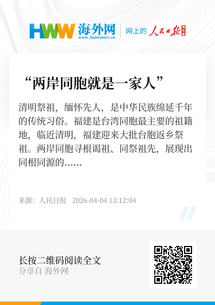“一同祭拜祖先,让我真切地感受到,两岸同胞就是一家人。”活动中,台胞黄毓勉动情地说,此次祭祖他特意带上了父母的照片,与他们一同认祖归宗,“清明追思,我们更期盼早日统一,两岸同胞共享福祉。”