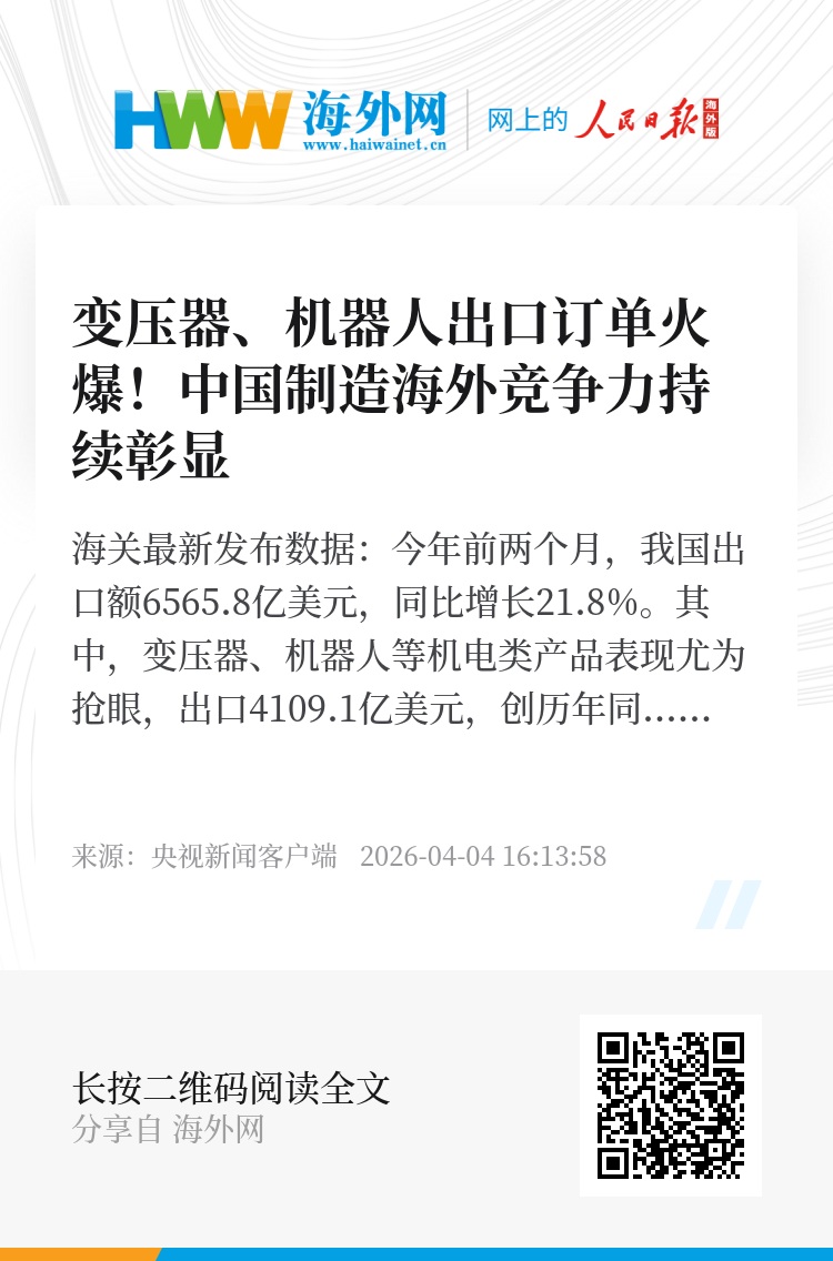 海关最新发布数据:今年前两个月,我国出口额6565.8亿美元,同比增长21.8%。其中,变压器、机器人等机电类产品表现尤为抢眼,出口4109.1亿美元,创历年同期新高,同比增长27.1%。机电类产品出口高增长的背后,隐藏着哪些硬核实力呢?