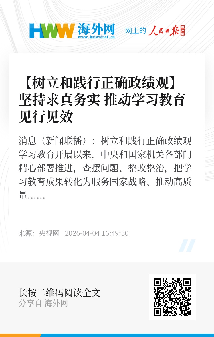 央视网消息(新闻联播):树立和践行正确政绩观学习教育开展以来,中央和国家机关各部门精心部署推进,查摆问题、整改整治,把学习教育成果转化为服务国家战略、推动高质量发展、保障民生改善的实际行动。
