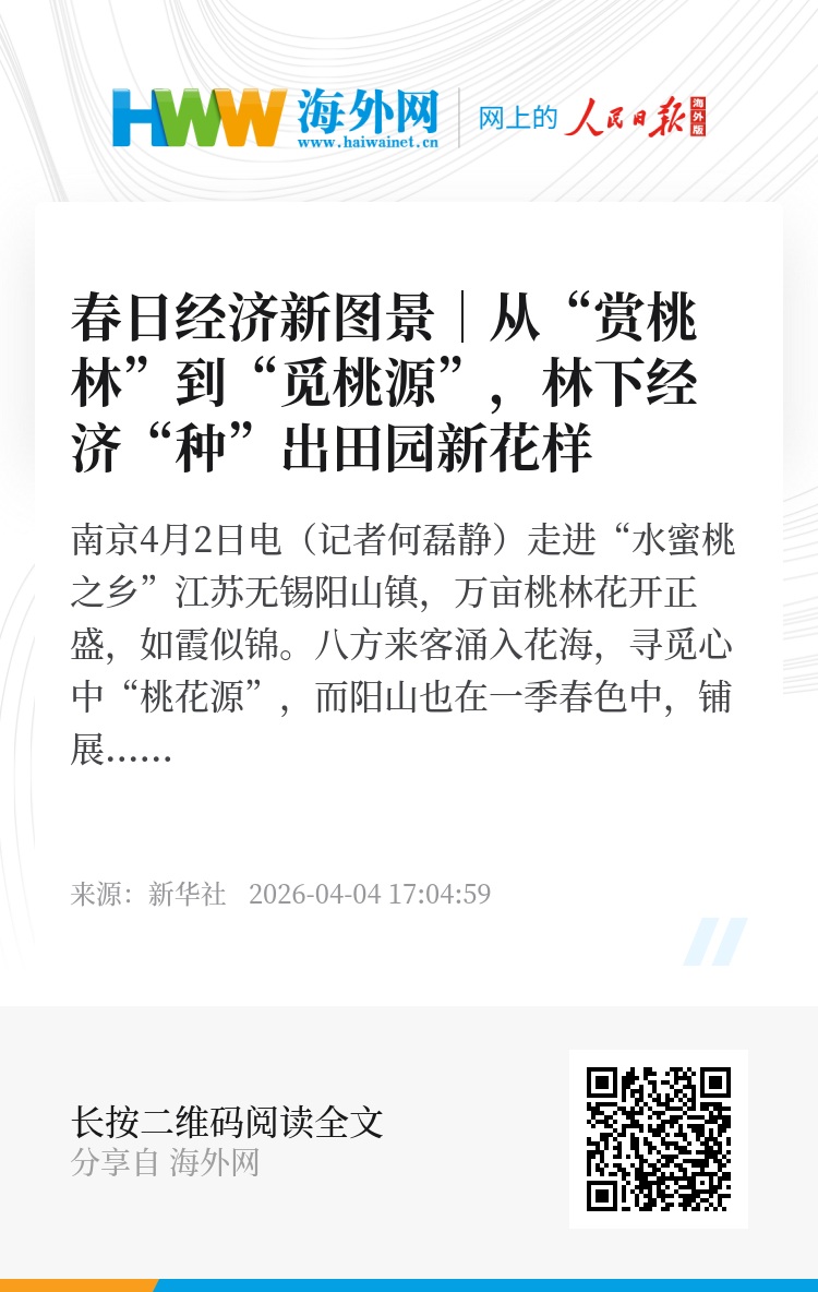 新华社南京4月2日电(记者何磊静)走进“水蜜桃之乡”江苏无锡阳山镇,万亩桃林花开正盛,如霞似锦。八方来客涌入花海,寻觅心中“桃花源”,而阳山也在一季春色中,铺展出“春日经济”新图景。