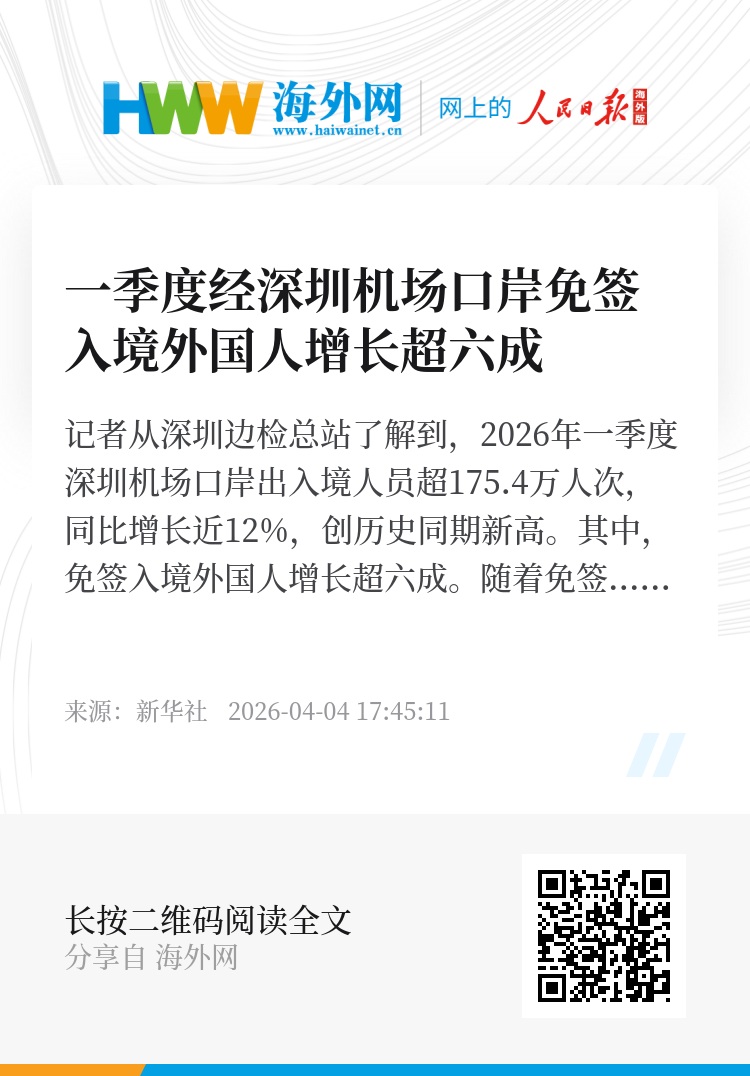 记者从深圳边检总站了解到,2026年一季度深圳机场口岸出入境人员超175.4万人次,同比增长近12%,创历史同期新高。其中,免签入境外国人增长超六成。