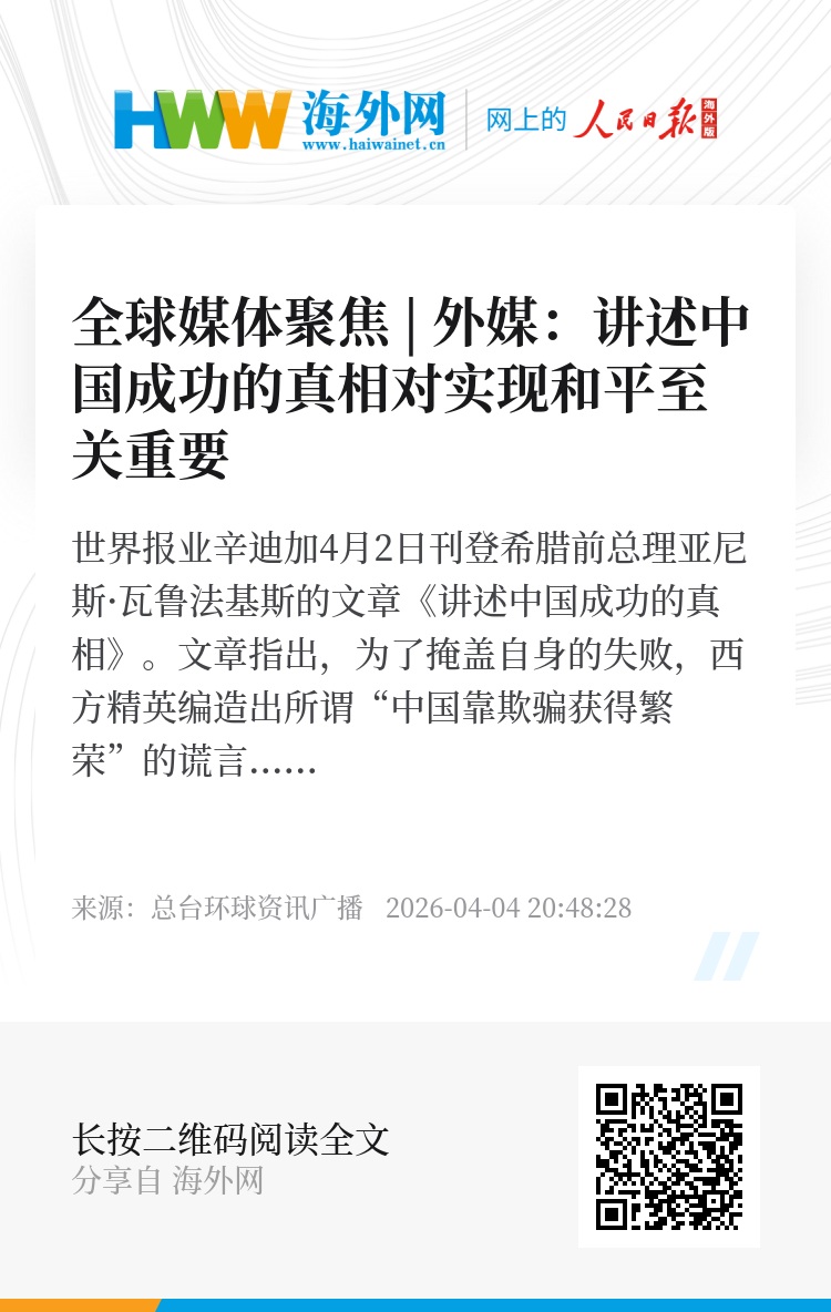 世界报业辛迪加4月2日刊登希腊前总理亚尼斯·瓦鲁法基斯的文章《讲述中国成功的真相》。文章指出,为了掩盖自身的失败,西方精英编造出所谓“中国靠欺骗获得繁荣”的谎言。更危险在于,这一谎言在某种程度上煽动了西方舆论为战争做准备。因此,讲述中国成功的真相至关重要。