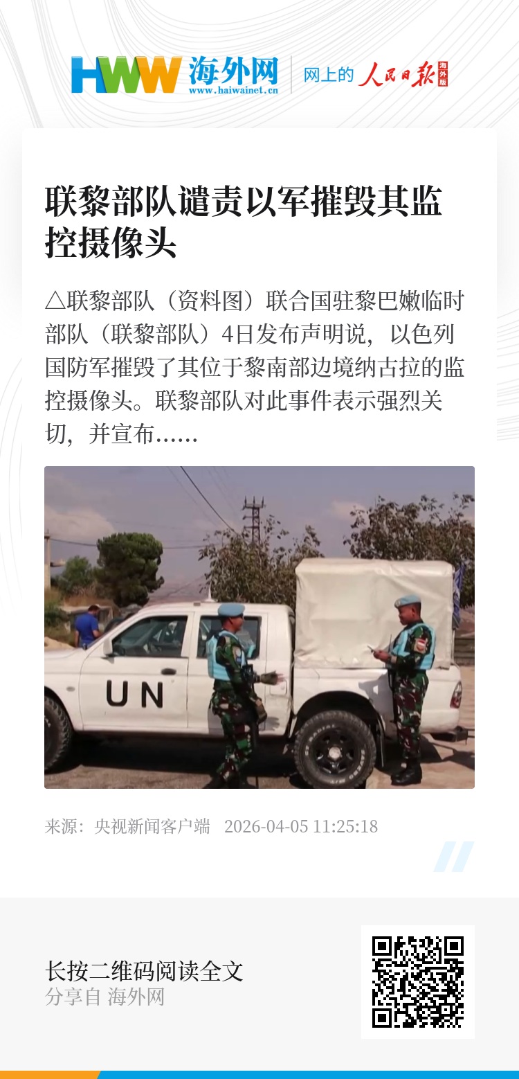 联合国驻黎巴嫩临时部队(联黎部队)4日发布声明说,以色列国防军摧毁了其位于黎南部边境纳古拉的监控摄像头。联黎部队对此事件表示强烈关切,并宣布将提交正式抗议。