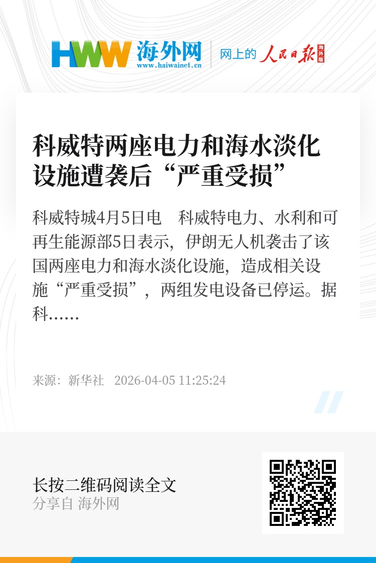 新华社科威特城4月5日电 科威特电力、水利和可再生能源部5日表示,伊朗无人机袭击了该国两座电力和海水淡化设施,造成相关设施“严重受损”,两组发电设备已停运。