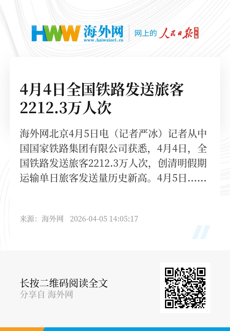 海外网北京4月5日电(记者严冰)记者从中国国家铁路集团有限公司获悉,4月4日,全国铁路发送旅客2212.3万人次,创清明假期运输单日旅客发送量历史新高。4月5日,全国铁路预计发送旅客1470万人次,计划加开旅客列车768列。