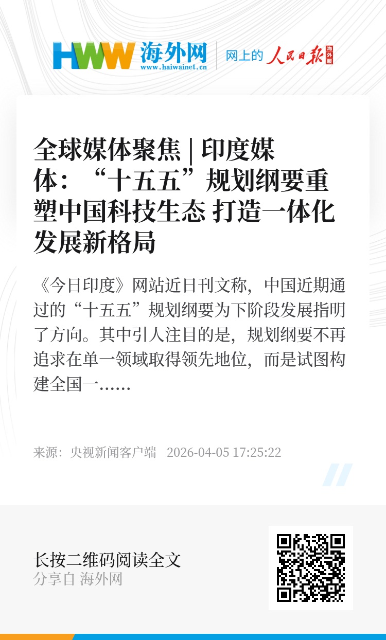 “十五五”规划纲要对科技领域的最新部署,为世界提供了怎样的发展范本?文章以印度为例称,印度下阶段的科技战略必须从“部门性任务”跃升为“系统性能力”,让前沿科技成为印度在生产力、治理与创新方面的核心驱动力。
