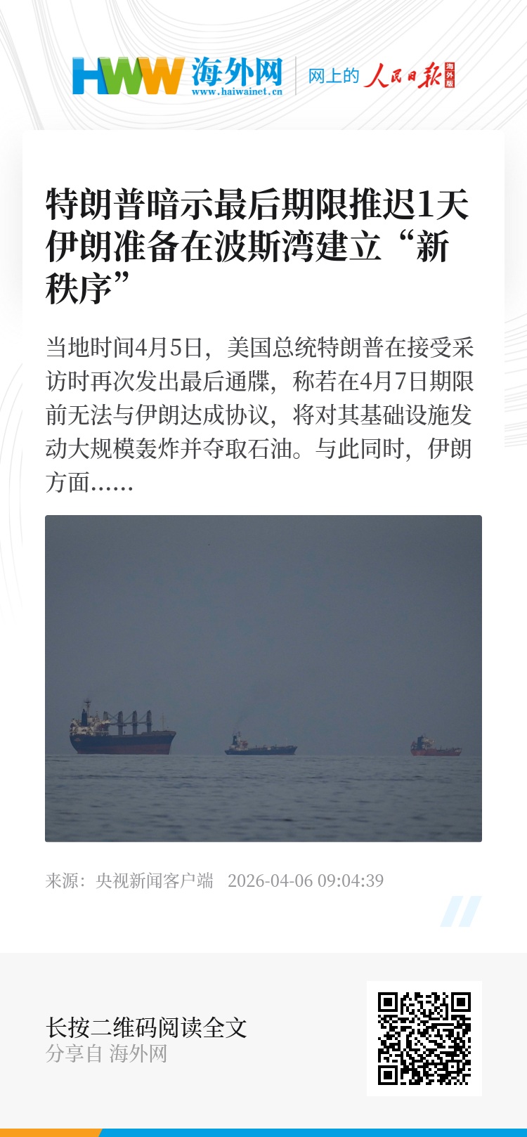 特朗普在社交媒体上发文说,“4月7日将是伊朗的发电厂日和大桥日”,暗示要猛烈轰炸伊朗的发电厂和大桥。他还说:“打开那个该死的海峡,否则你们将活在地狱中——走着瞧!”