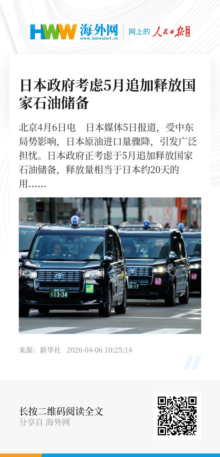 新华社北京4月6日电 日本媒体5日报道,受中东局势影响,日本原油进口量骤降,引发广泛担忧。日本政府正考虑于5月追加释放国家石油储备,释放量相当于日本约20天的用量。