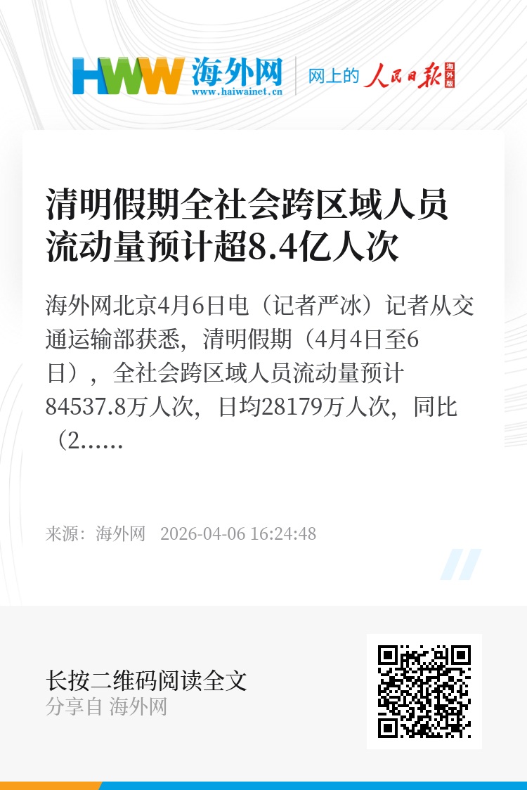 海外网北京4月6日电(记者严冰)记者从交通运输部获悉,清明假期(4月4日至6日),全社会跨区域人员流动量预计84537.8万人次,日均28179万人次,同比(2025年清明节假期期间,下同)增长6%。