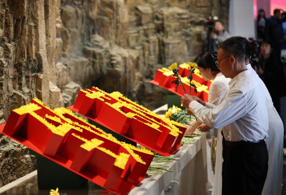 4月3日,参加活动的社会各界代表在中国人民抗日战争纪念馆向抗战英烈献花。新华社记者 张晨霖 摄