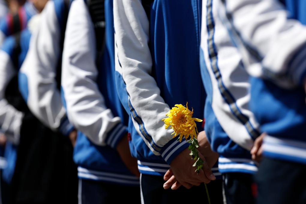 4月3日,在宁夏任山河烈士陵园,学生准备向烈士墓碑献花。新华社记者 王鹏 摄